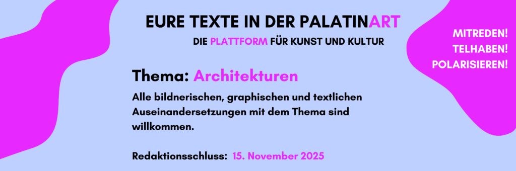 Alle Einsendungen bitte bis zum 15. November an palatinart@bv-pfalz.de oder verlag@na-verlag.de senden. Spätere Einsendungen können nur bedingt berücksichtigt werden.